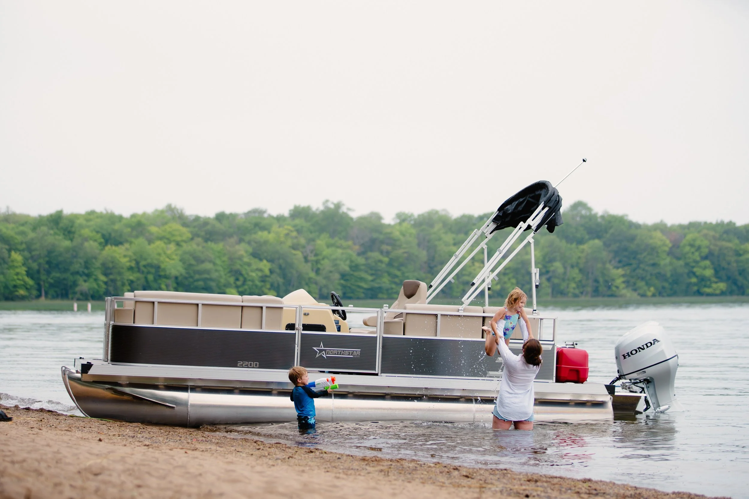 A woman and two children enjoying a day at the lake with a pontoon boat. The woman is helping a young girl onto the boat while a young boy stands in the shallow water holding a water gun. The boat is docked on the sandy shore, with a lush green treeline in the background.